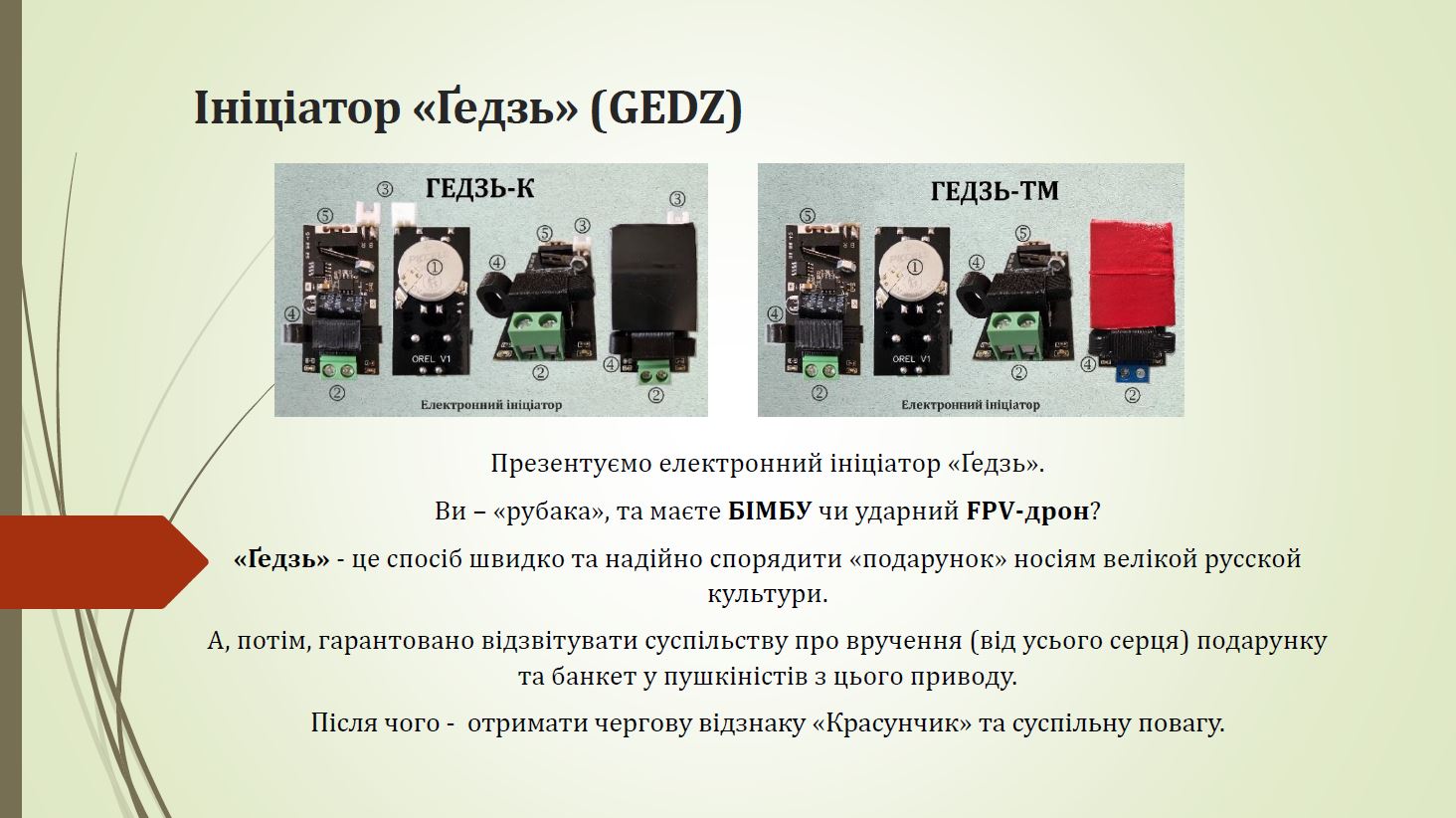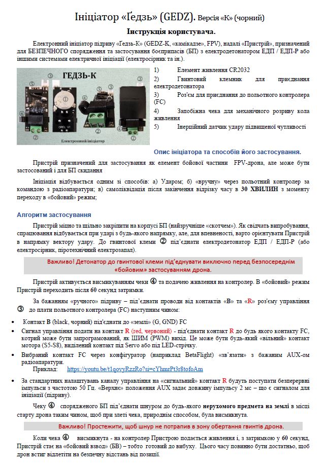 Електронний ініціатор підриву «Ґедзь-К» (GEDZ-K, «камікадзе», FPV), надалі «Пристрій», призначений для БЕЗПЕЧНОГО спорядження та застосування боєприпасів (БП) з електродетонатором ЕДП / ЕДП-Р або іншими системами електричної ініціації (електросірник та ін.).