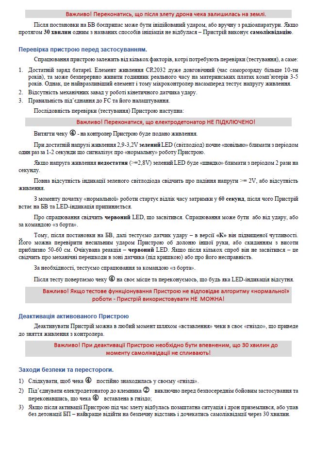 Пристрій призначений для застосування як елемент бойової частини FPV-дрона, але може бути застосований і для БП скидання
